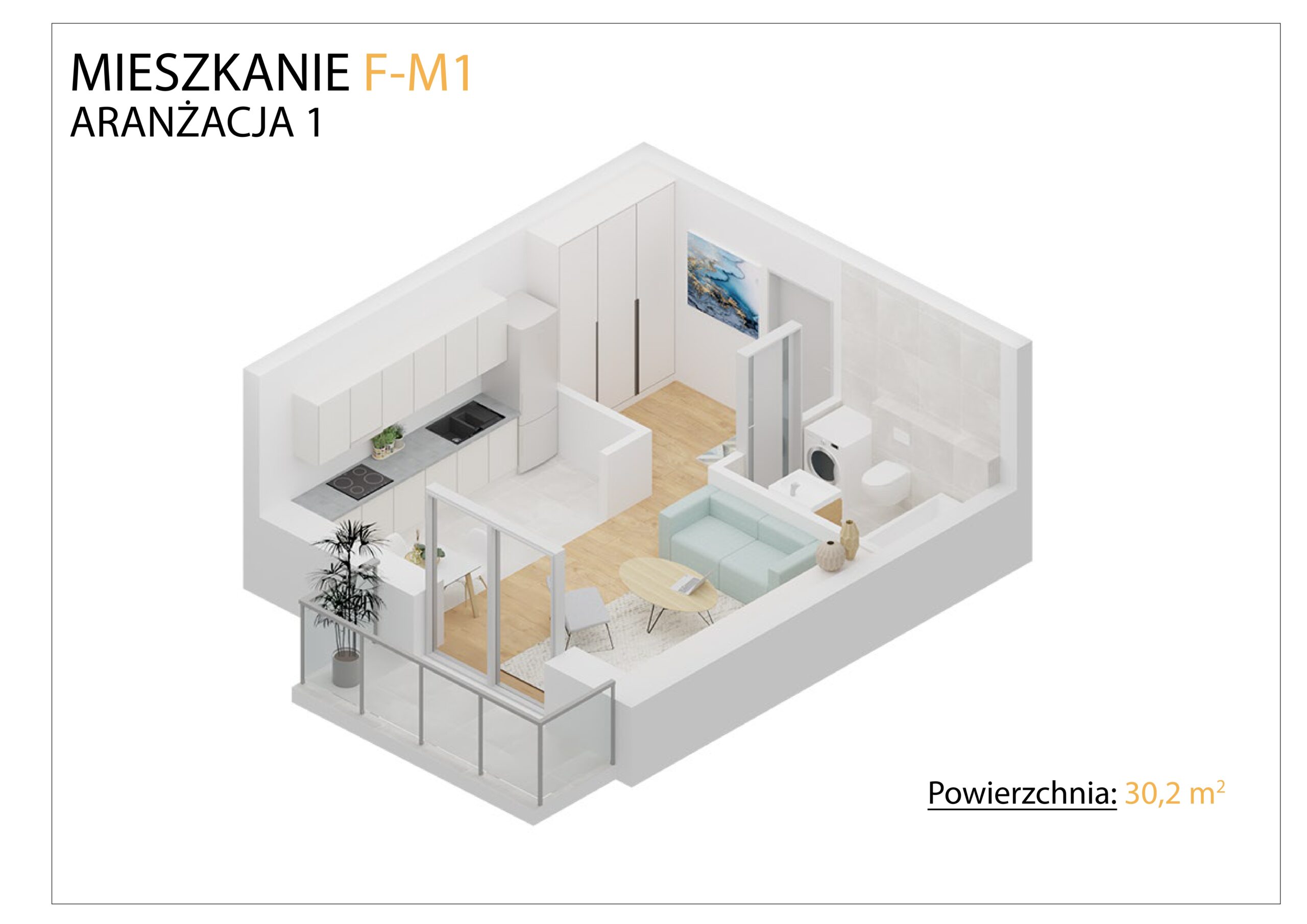 mieszkanie 1 (F-3M) – przytulna kawalerka o powierzchni 30,2 m2 z balkonem, odpowiednia dla singla lub pary;